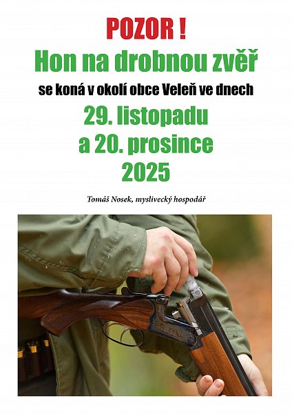 Informace mysliveckého sdružení - ve dnech 29.11. a 20.12. 2025 bude v okolí obce Veleň probíhat hon na drobnou zvěř.