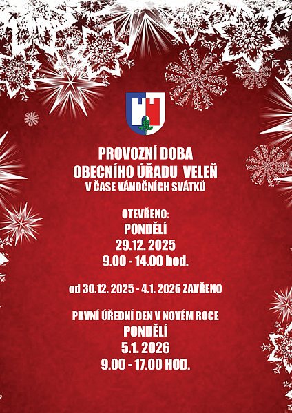 Otevírací doba OÚ Veleň v době vánočních svátků 2025
