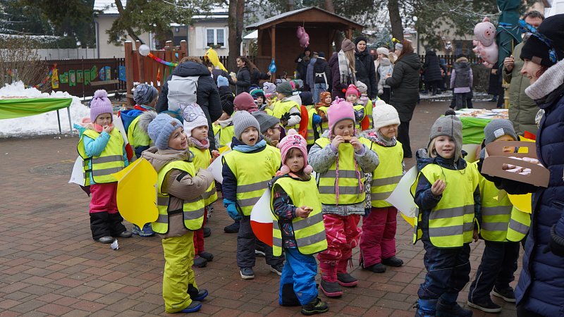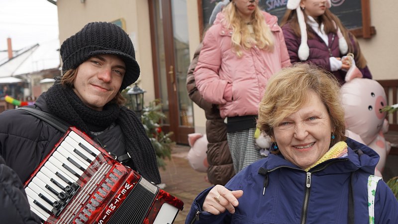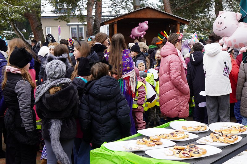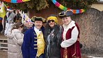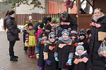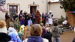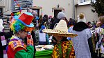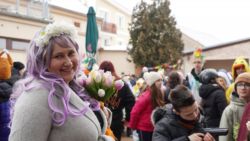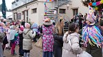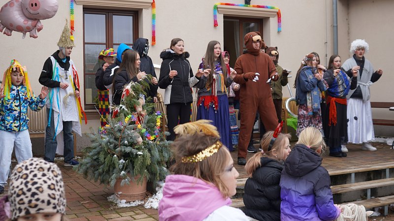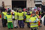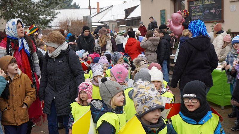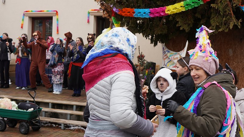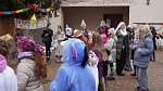 Masopustní průvod ZŠ a MŠ Veleň na obecním dvorku